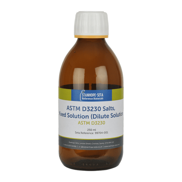 Produced in general accordance with the principles of ISO 17034 and ISO 33405, the Salt in Crude Mixed Salt Solution is a volumetric blend of Calcium chloride (CaCl2), Magnesium chloride (MgCl2) and Sodium chloride (NaCl) solutions, produced by accurately measuring the volumes of the solutions in proportions of 10%, 20% and 70% respectively as specified in ASTM D3230.